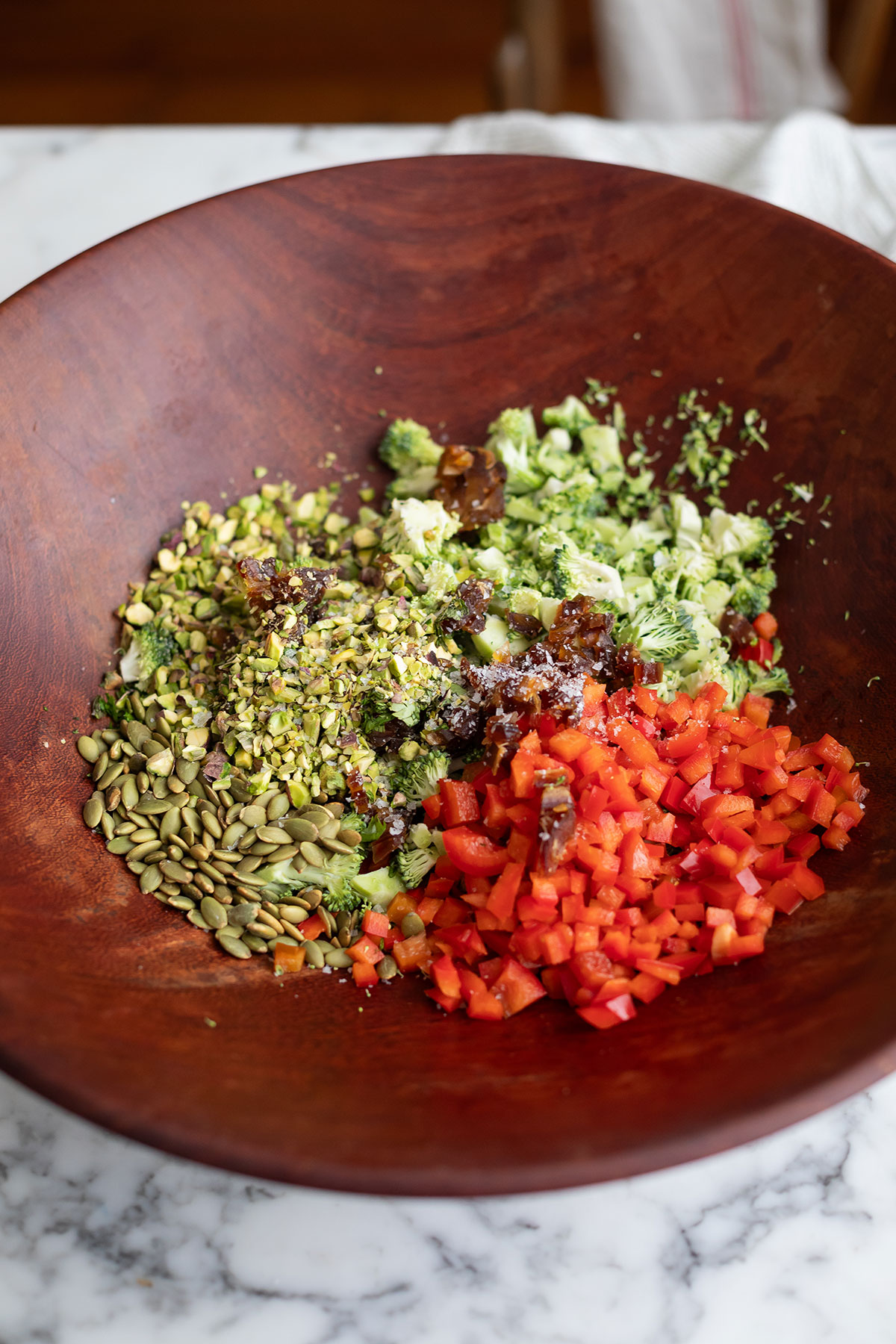 This broccoli salad is brilliant for entertaining because you can prepare it in advance. Make the dressing and chop all the salad components ahead of time. The salad actually benefits from letting the dressing soak into the broccoli for 20 minutes to 3 hours before serving. Mix everything together except the nuts and seeds (do this anywhere from 30 minutes to 3 hours before serving), then toss in the pistachios and pumpkin seeds just before serving to retain their crunch.